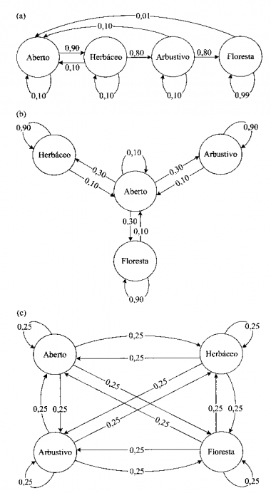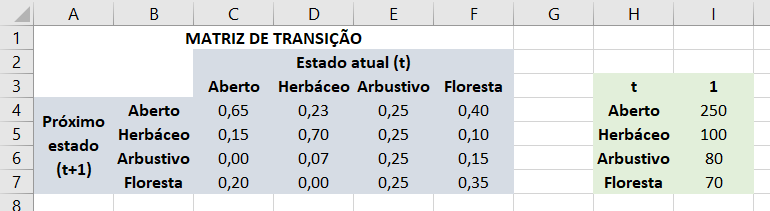 Observando o estado atual Aberto (coluna 1), sabemos que há 65% de chance de ele continuar Aberto, 15% de virar Herbáceo e 20% de virar Floresta. Note que, como a terceira linha desta coluna é 0, não há possibilidade de em espaço Aberto virar Arbustivo no próximo passo e que a soma de todas as probabilidades dá 1.