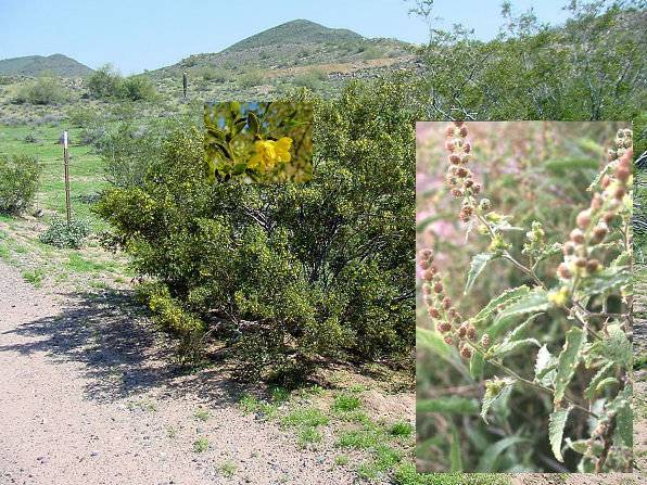 No centro da foto encontra-se a chaparra (Larrea tridentata) um arbusto que pode se tornar uma arvoreta (detalhe da flor) e no canto direito um detalhe da ambrósia americana