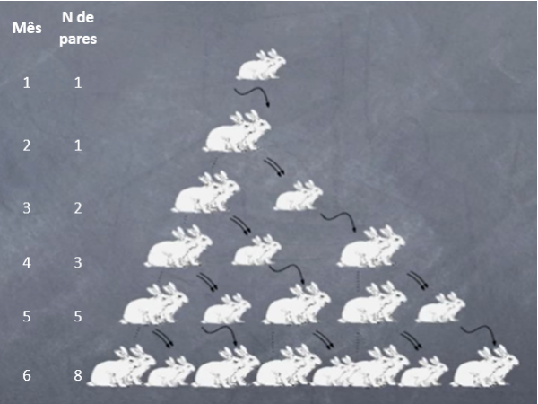 Então se contarmos os pares de coelhos no começo de cada mês, teremos: Mês 1: um par imaturo Mês 2: este mesmo par amadurece Mês 3: estes terão sua primeira prole Mês 4: a prole produzida amadurece e os coelho já maduro se reproduz novamente E assim por diante…a|PanTheria]] )).