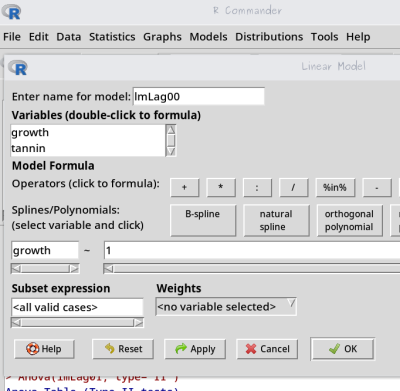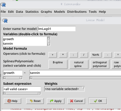 • monte um novo modelo linear, chamado lmLag01, pelo menu ( Statistics > Fit Models > Linear Models), selecione: