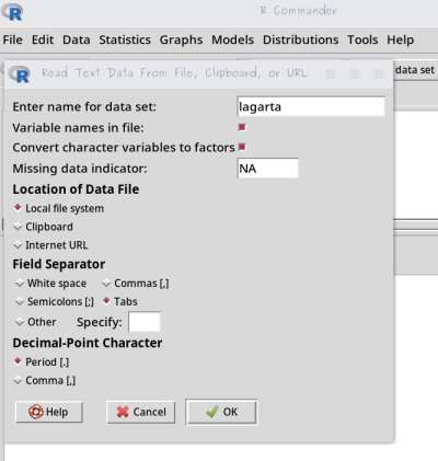 • garanta que o os dados lagarta estão ativos no Rcmdr;