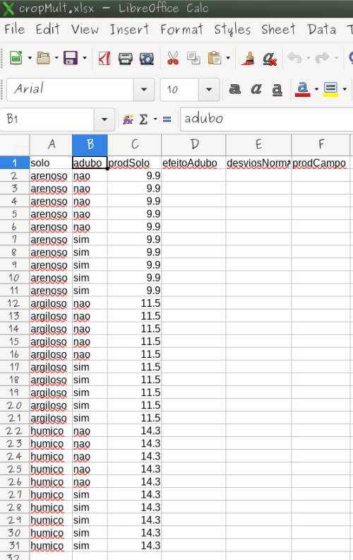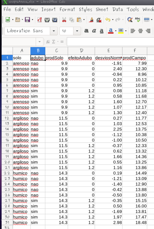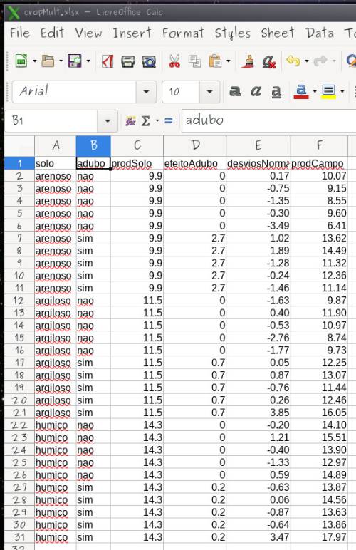 adubo igual a simadubo igual a não = NORM.INV(RAND(), 0, 1.5) = NORM.INV(RAND(), 0, 1.5)solo e adubodesQuadTotal - resQuad) sobre a desvQuadTotal. Ou seja, quanto da variação dos dados é explicada pelo modelo em relação ao total de variação dos dados