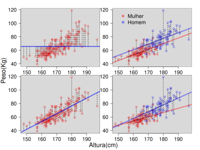 Nesse exemplo estamos interessados em entender a influência de altura e sexo no peso dos indivíduos. Neste caso temos alguns modelos plausíveis concorrentes que iremos nomear como:
