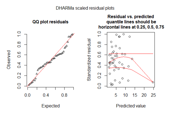 Florian Hartig (2016). DHARMa: Residual Diagnostics for Hierarchical (Multi-Level/Mixed) Regression Models. R package. version 0.1.2. https://github.com/florianhartig/DHARMa