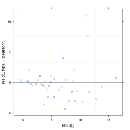 Agora, vamos modificar o modelo do roteiro de LMM apenas em relação à distribuição de probabilidades dos resíduos do modelo. Operacionalmente isso é bastante simples, basta usar a função glmer() do pacote lme4 com a mesma formulação do modelo usada anteriormente, explicitando a distribuição (family = “poisson”).