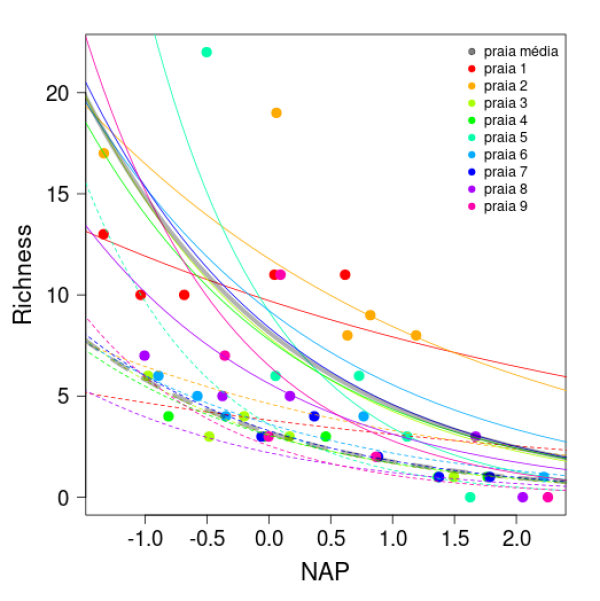 Finalmente, vamos plotar um gráfico com os dados e as curvas de predição para o modelo que foi selecionado - efeito aditivo de `Exposure` e `NAP`. Vamos seguir os passos anteriores para calcular os valores preditos para cada praia e para a estrutura fixa do modelo. Note que agora temos duas curvas para cada praia, representando as exposições alta e baixa.