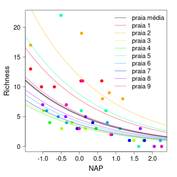 ## coeficientes da estrutura aleatória randcoef <- coef(mod.riq)$Beach randcoef ## coeficientes da estrutura fixa do modelo fixcoef <- fixef(mod.riq) fixcoef ## valores da preditora em uma sequencia seqNAP <- seq(-1.5, 2.5,len=100) ## estimativas para cada praia beach01 <- randcoef[1,1] + randcoef[1,2] * seqNAP beach02 <- randcoef[2,1] + randcoef[2,2] * seqNAP beach03 <- randcoef[3,1] + randcoef[3,2] * seqNAP beach04 <- randcoef[4,1] + randcoef[4,2] * seqNAP beach05 <- randcoef[5,1] + randcoef[5,2] * seqNAP beach06 <- randcoef[6,1] + randcoef[6,2] * seqNAP beach07 <- randcoef[7,1] + randcoef[7,2] * seqNAP beach08 <- randcoef[8,1] + randcoef[8,2] * seqNAP beach09 <- randcoef[9,1] + randcoef[9,2] * seqNAP beachFix <- fixcoef[1] + fixcoef[2] * seqNAP