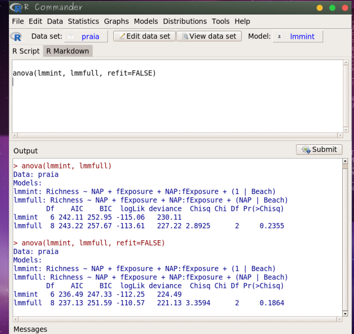 Um problema com a interface do Rcmdr é que precisamos incluir o argumento refit = FALSE na função anova para garantir que o procedimento irá manter a estimativa por REML e não irá reajustar os modelos por ML antes de comparar os modelos. O padrão da função anova quando aplicada à comparação de dois modelos mistos é reajustar para ML. Como a interface não oferece essa opção precisamos editar a linha de comando do painel superior.