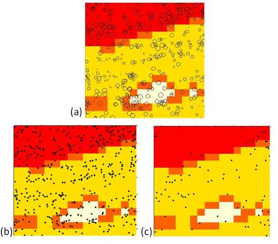 Mapas de distribuição para C. brasiliense na parcela permanente PP-Biota em restinga alta da Ilha do Cardoso, Cananéia, SP, representando a distribuição espacial (a) de todas as classes de diâmetros ≥ 4,8 cm, (b) dos adultos (DAP > 14 cm) e © dos jovens (4,8 ≤ DAP ≤ 14,0 cm). Cores diferentes representam os quatro tipos de solos, como classificados na Fig. 2. No mapa (a) os círculos representam os indivíduos de C. brasiliense e seus tamanhos são proporcionais aos DAPs observados. Nos mapas (b) e © os indivíduos adultos e jovens, respectivamente, estão representados pelos pontos pretos.