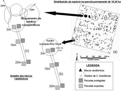 Para testar os efeitos dependentes da densidade propostos pelo modelo Janzen-Connell, nós avaliamos a sobrevivência e o desempenho de plântulas de Calophyllum brasiliense em relação à distância e à densidade de adultos co-específicos e a correlação destes com a herbivoria. Foram transplantadas 1200 plântulas de C. brasiliense em 10 blocos experimentais, centrados em um adulto co-específico focal cada um, em um delineamento do tipo split-plot (figura ao lado) .