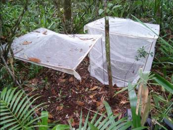 Nós combinamos duas condições de exposição à herbivoria (parcelas protegidas vs. expostas, figura abaixo) a três níveis de distância (3, 10 e 20 m) em cada bloco, sendo que metade dos blocos foi composto por apenas um adulto co-específico isolado e a outra metade por um agrupamento, gerando o terceiro tratamento: dois níveis de densidades de adultos co-específicos (isolados vs. agrupados).