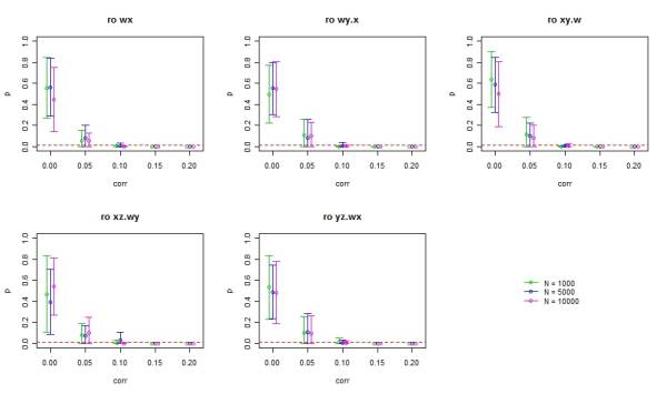Note que os resultados parecem não diferir entre as correlações nem entre números de permutação. O teste parece robusto, uma vez que em nenhuma vez, quando a correlação simulada era zero, o teste resultou em um p < 0,01 (alfa corrigido por Bonferroni). Por outro lado, há uma janela entre 0 e 0,10 em que pode haver erro do tipo II, acima de 0,10 é muito grande a chance de que o teste detecte a relação entre as variáveis.