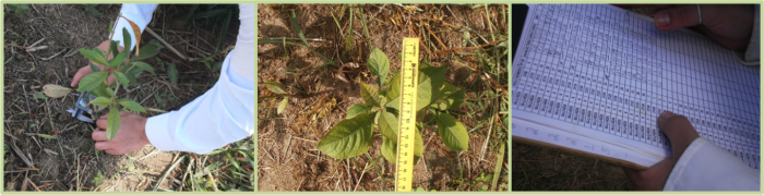Após o plantio, a área foi roçada a cada 3 meses para evitar competição das gramíneas invasoras com as mudas. De fevereiro de 2012 a março de 2014, ocorreram quatro monitoramentos semestrais de metade das mudas, com registro de dados de sobrevivência, crescimento em altura, diâmetro e área de copa.