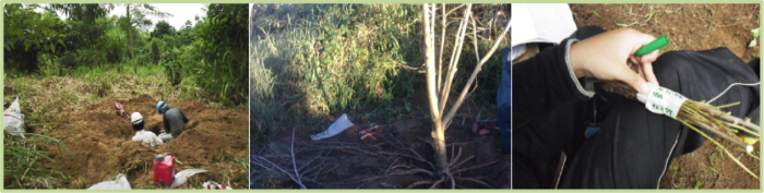O peso fresco de cada fração (caule, galhos folhas) foi medido em campo e o peso seco, em laboratório. No caso de mudas com diâmetro à altura do solo (DAS) maior do que 2,5 cm, que não poderiam ser coletadas inteiras, o peso fresco foi registrado a partir de uma sub-amostra, cujo peso seco serviu de base para estimar o peso seco total da fração.