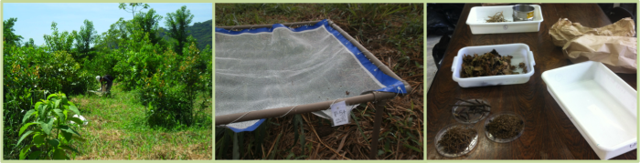 Três coletores de serapilheira foram instalados no centro de cada uma das 62 parcelas da área em restauração. Cada coletor amostrava uma área de 0,5 m². O material, que foi coletado mensalmente durante dois anos, era levado ao laboratório, seco em estufa e pesado.