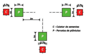 A área de estudo foi dividida em 62 parcelas, distribuídas em 6 combinações de tratamento e uma parcela controle (sem plantio). Com isso, foram obtidos 9 blocos (réplicas), cada um contendo todas as combinações de tratamento. As combinações de tratamento utilizadas foram: