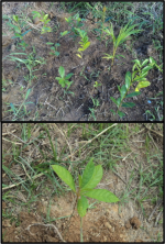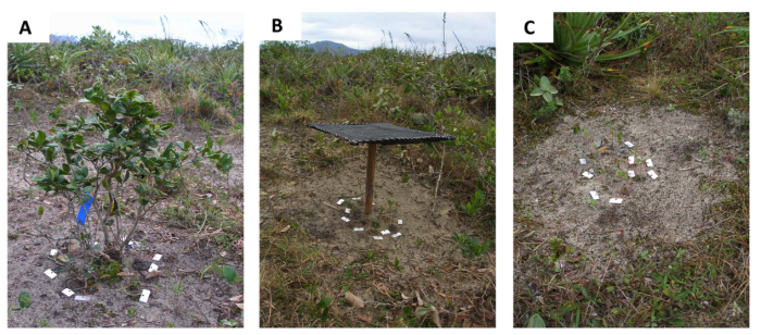 Imagens de um estudo realizado para testar o efeito da facilitação sobre a germinação de sementes de Ternstroemia brasiliensis, em área de restinga arbustiva. As sementes foram colocadas para germinar em três diferentes condições: A) sob um indivíduo de Guapira opposita; B) sob uma estrutura que mimetiza a sombra de uma planta; C) a pleno sol. Castanho 2012