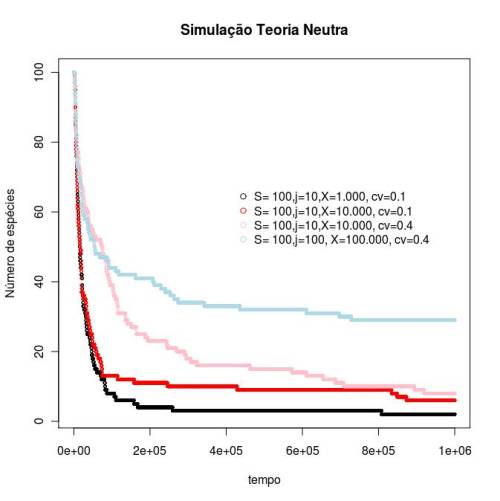 ### Simulações de Cenários Nulos #### ## 04 de maio de 2011 #S = número de espécies da comunidade : inteiro positivo #J = número de indivíduos da comunidade (tamanho da comunidade): inteiro positivo #xi = número de propágulos que o indivíduo i produz por intervalo #cv = proporção de variação na produção de propágulos em relação a sua esperança: real positivo #X = total de propágulos que um indivíduo produz (esforço reprodutivo total): inteiro positivo ### Aumentando o número de indivíduos da comunidade ## Já rodados: # padrão 1: S= 100, j=10, X=1.000, cv=0.1, ciclo=1e6, step=100 # cenario 2: S= 100, j=10, X=10.000, cv=0.1, ciclo=1e6, step=100 # cenário 3: S= 100, j=10, X=10.000, cv=0.4, ciclo=1e6, step=100 # cenário 4: S= 100, j=100, X=100.000,cv=0.4, ciclo=1e6, step=100 ## A PARTIR DO CENÁRIO 2 VARIANDO O CV: # cv=0.01 sn_cv0.01=simula.neutra.step(S=100, j=10,X=10000, cv=0.01, ciclo=1e6, simula=100) # cv=0.05 sn_cv0.05=simula.neutra.step(S=100, j=10,X=10000, cv=0.05, ciclo=1e6, simula=100) # cv=0.15 sn_cv0.15=simula.neutra.step(S=100, j=10,X=10000, cv=0.15, ciclo=1e6, simula=100) # cv=0.3 sn_cv0.3=simula.neutra.step(S=100, j=10,X=10000, cv=0.3, ciclo=1e6, simula=100) # cv=0.6 sn_cv0.6=simula.neutra.step(S=100, j=10,X=10000, cv=0.6, ciclo=1e6, simula=100) # cv=0.9 sn_cv0.9=simula.neutra.step(S=100, j=10,X=10000, cv=0.9, ciclo=1e6, simula=100) # cv=1.2 sn_cv1.2=simula.neutra.step(S=100, j=10,X=10000, cv=1.2, ciclo=1e6, simula=100) # cv=1.6 sn_cv1.6=simula.neutra.step(S=100, j=10,X=10000, cv=1.6, ciclo=1e6, simula=100) # cv=2.0 sn_cv2.0=simula.neutra.step(S=100, j=10,X=10000, cv=2, ciclo=1e6, simula=100)