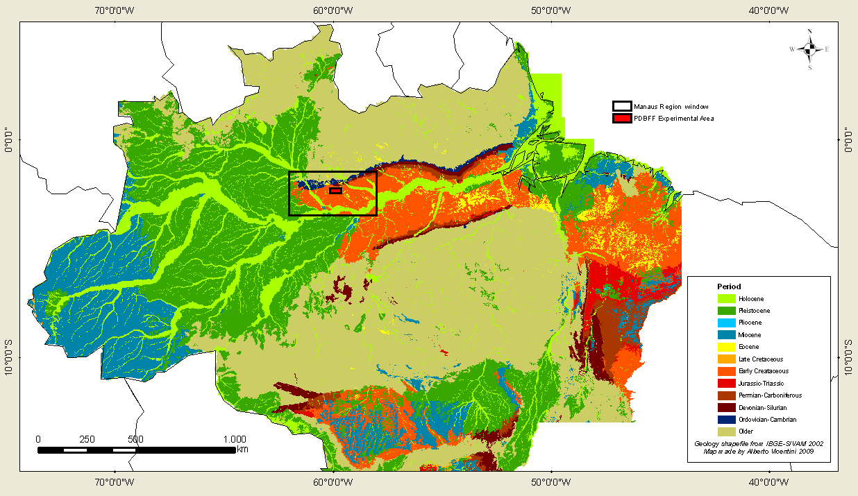 A parcela de 25 hectares está localizada aproximadamente 60 km ao Norte da cidade de Manaus, Amazonas, Brasil. A parcela fica sobre a formação geológica Alter do Chão, que é constituída de sedimentos fluviais e flúvio-lacustres que remontam ao Cretáceo Inferior e que preencheram a região entre os escudos Brasileiro e das Guianas (veja este mapa) muito antes da inversão da drenagem da bacia e a formação do rio Amazonas propriamente dito.