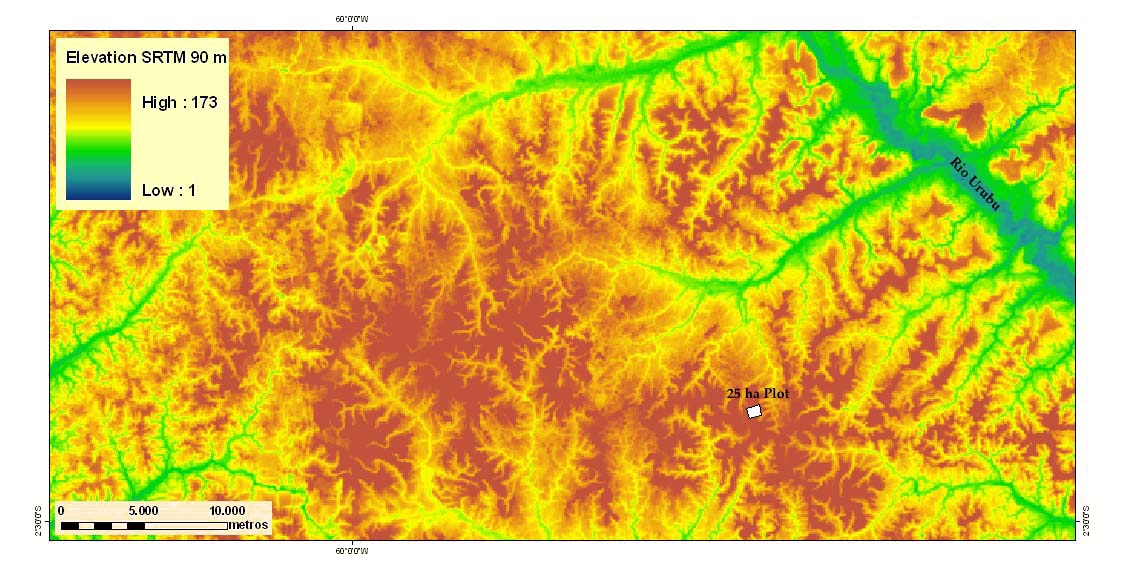 A parcela de 25 ha está localizada nas proximidades de Manaus, na área experimental do Projeto Dinâmica Biológica de Fragmentos Florestais PDBFF, projeto de colaboração entre o Instituto Nacional de Pesquisas da Amazônia INPA e o Smithsonian Tropical Research Institute STRI.
