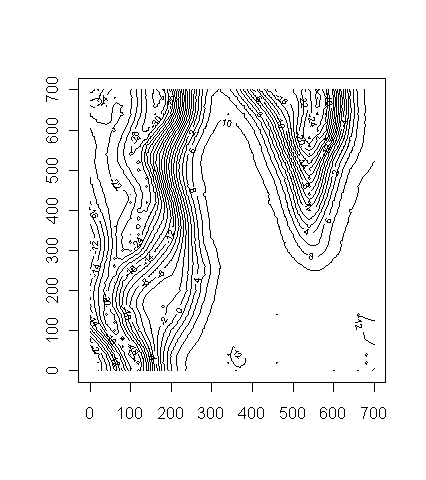 contour(seq(0,700,by=5),seq(0,700,by=5),t(mat.elev5),nlevels=35)