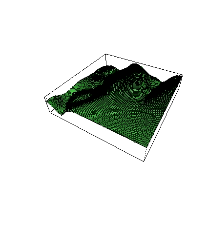 persp(t(mat.elev5),phi=40,theta=30,d=0.8,asp=1,scale=T,expand=0.2,col=“green”, xlab=“ ”, ylab=“ ”, zlab=“alt”, axes=F)
