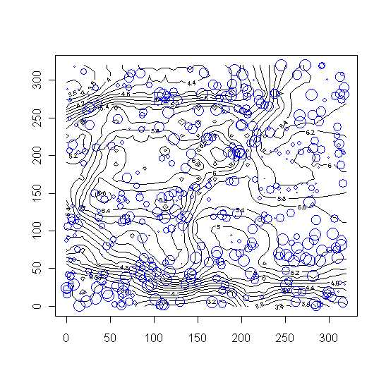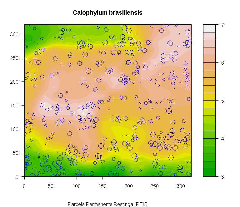 Os mapas foram feitos no R e segue o script, atualizado. A localização das árvores parece estar ok, mas não deixe de conferir! No meu esquema do mapeamento das árvores o ponto (x=0, y=0) é a A00 e o (x=320,y=320) o final da parcela P15. Primeiro fiz o mapa com o dap proporcional ao tamanho do circulo, mas como ficou confuso precisei separar em 6 classes de diâmetro. Não importa muito, só precisamos dizer que o tamanho do circulo é proporcional ao diâmetro.