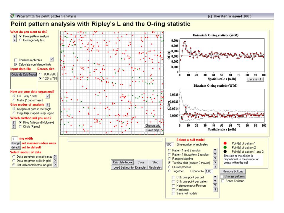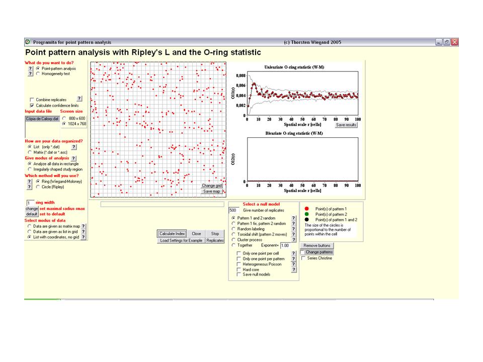 Segundo Wiegand & Moloney (2004) a questão científica com a qual nos deparamos em relação a utilização de métodos para análise de padrão espacial de pontos é saber em que momento usar uma estatística cumulativa (i.e., L-Ripley) ou uma não cumulativa (i.e.,O-ring). Sugerem que se o efeito causado pelo processo investigado ocorra hipoteticamente até uma certa distância, seria o caso de utilizar a cumulativa. Já, se a pergunta passa por escalas críticas nas quais os processos atuam, o mais adequado é usar estatísticas cujos resultados em pequenas escalas não influenciem o resultado em escalas maiores (já que L-Rilpey podem obscurecer a existência de escalas críticas). Como a maioria dos processos biológicos (nisso inclui-se os dependentes da densidade, que são o arcabouço teórico no qual meu estudo está inserido) operam em diferentes escalas e podem ter sobreposição de padrões de outros processos, achei conveniente utilizar os dois métodos como complementares. Entretanto, ao longo da interpretação dos resultados, acabei achando mais intuitivo interpretar os resultados do O-ring, apesar de ter achado que os resultados entre as duas análises se reforçaram.