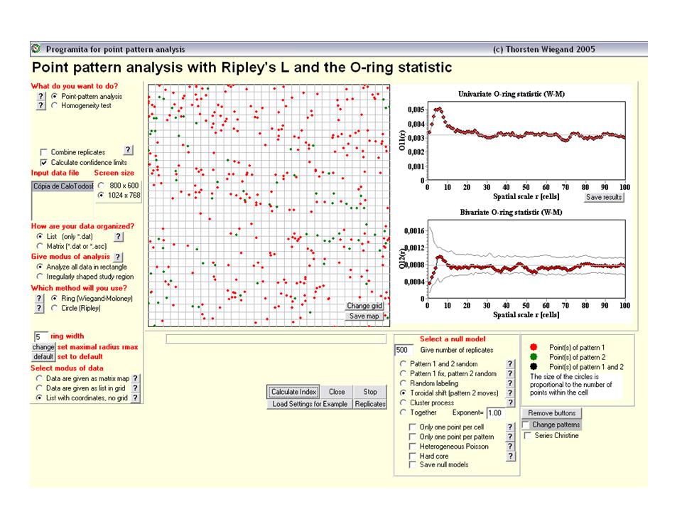 - Só para testar, adotei dois tipo de modelos nulos: (1) Completa Independência Espacial, onde utilizei as técnicas de toroidal shift (Padrão 2 se move de forma toroidal ao redor do padrão 1 - usado em casos onde o padrão 2 é dependente do 1, o qual foi criado por algum processo randômico) e “Padrão 1 e 2 randômicos” (quando dois processos independentes, mas que ocorrem simultaneamente, são responsáveis por gerar os dois padrões)para verificar a independência entre a distribuição dos indivíduos jovens em relação aos adultos; (2)Condição antecedente, onde foi considerado o “Padão 1 fixo e o padrão 2 randômico” (quando os tipos de pontos são criados em tempos diferentes (em sequencia), e o padrão 1 não mudou durante a criação do padrão 2 e influenciou o desenvolvimento do padrão 2 - é apontado como apropriado para testar a relação entre árvores adultas e recrutamentos).