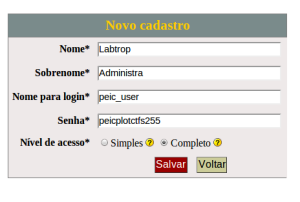 O usuário labtrop tem acesso administrativo. Pode criar usuários e senhas além de fazer modificações e consultas. Gabriel e Juliana devem criar usuários próprios a partir da interface para que as modificações feitas sejam identificadas.