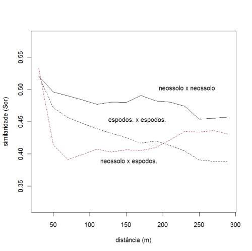 há correlação espacial na medida de similaridade entre os hábitats em pequenas distâncias (< 50m) e apesar disso os hábitats SÃO DIFERENTES NA COMPOSIÇÃO até certa distância (ca.200 m). A partir dai ainda se diferencia o Neossolo como sendo uma unidade distinta, mas o Espodossolo já não se diferencia mais. O Espodossolo apresenta uma correlação espacial que se mantem a longas distâncias e com isso a variação interna nesse habitat chega a ser superior do que a variação entre habitats em distâncias maiores. Provavelmente há uma agregação em escalas menores nesse habitat(?).