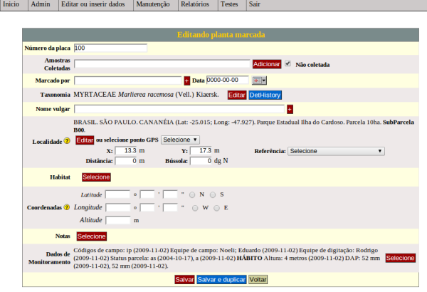 >Editar ou inserir dados>Plantas Marcadas>Monitoramento>Editar uma Planta
