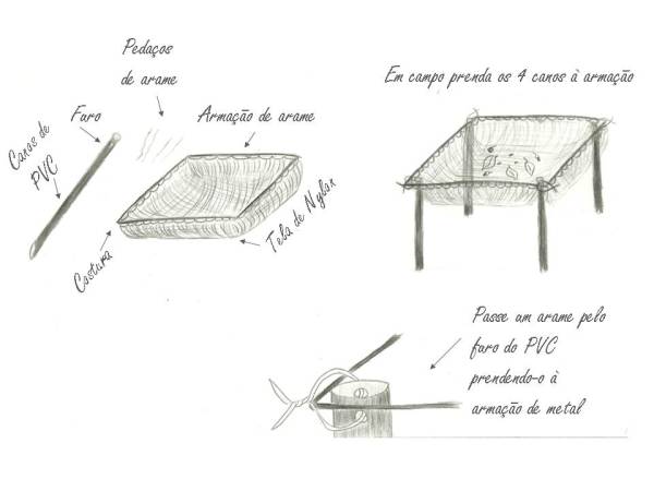 A idéia é levar os canos de PVC e a armação+tela para campo separadamente e prendê-los em campo com a ajuda de arame.