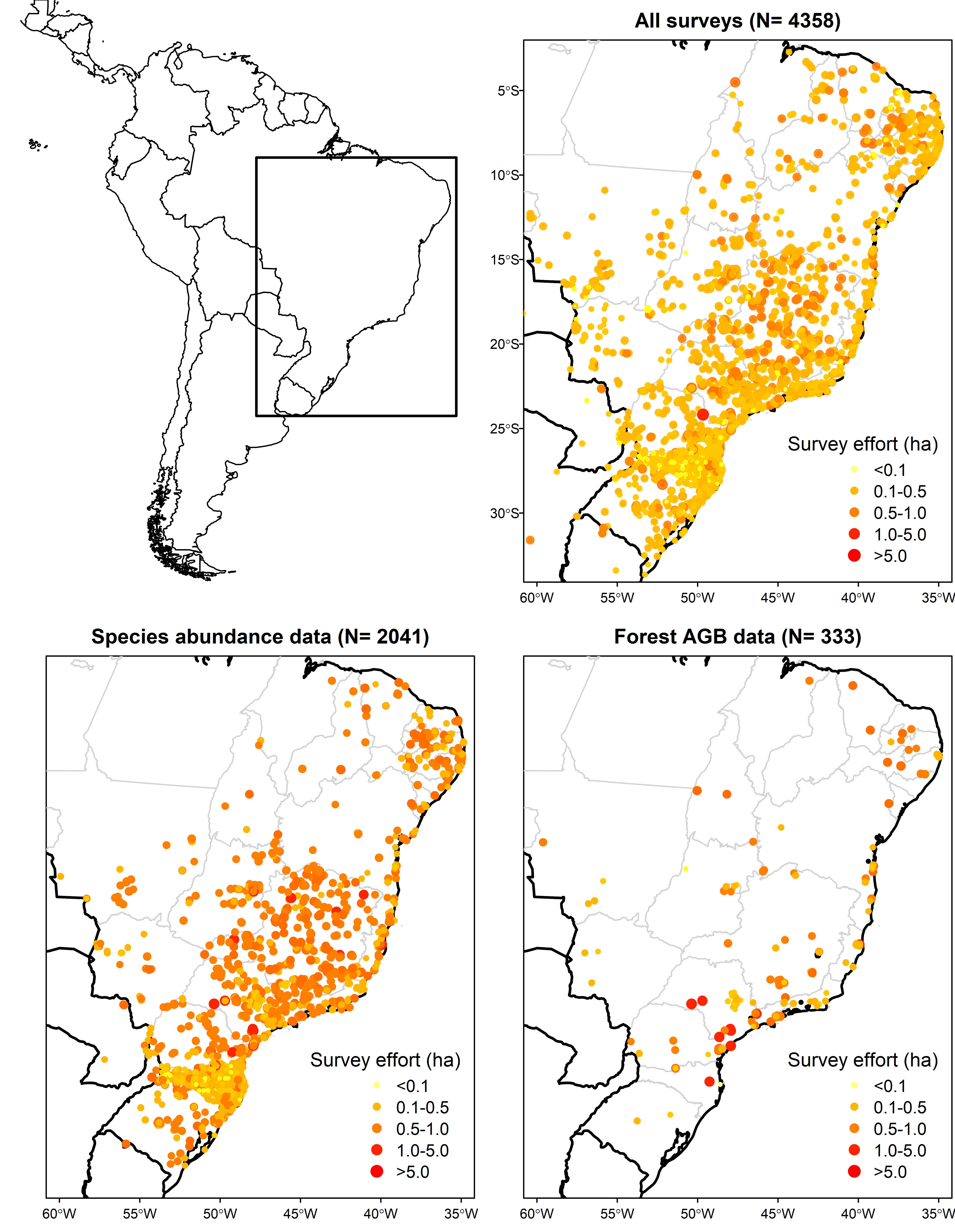 Figure 1. The current geographical extent covered by TreeCo (top left), the distribution of all the quantitative vegetation inventories stored in the database (top right), the inventories with species abundance data already entered in the database (bottom left), and the inventories with information on Tree Above-ground Biomass (AGB), excluding data from state forest inventories (bottom right). Thick lines present the official limits of Latin America, while the grey lines define the Brazilian states. The number of inventories with geographical coordinates (N) is given for each panel.